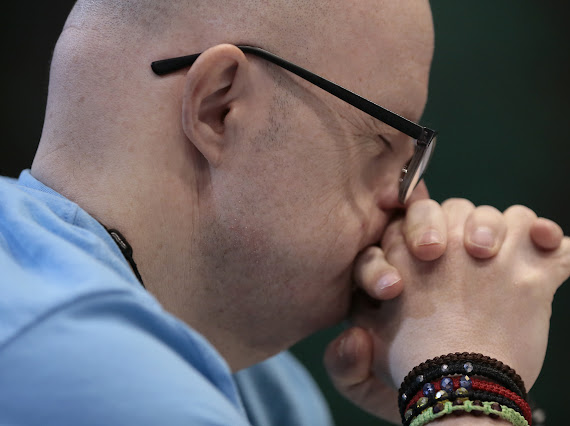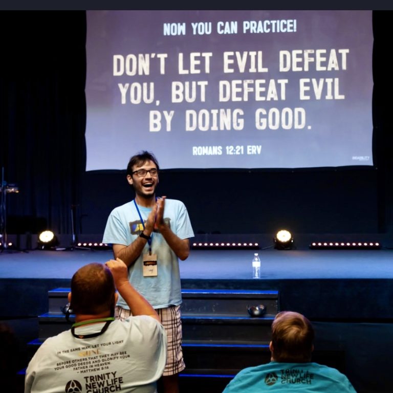 Image Description: A man stands on stage clapping and smiling to an audience, with a projection behind him displaying Romans 12:21: “Don't let evil defeat you, but defeat evil by doing good.”.