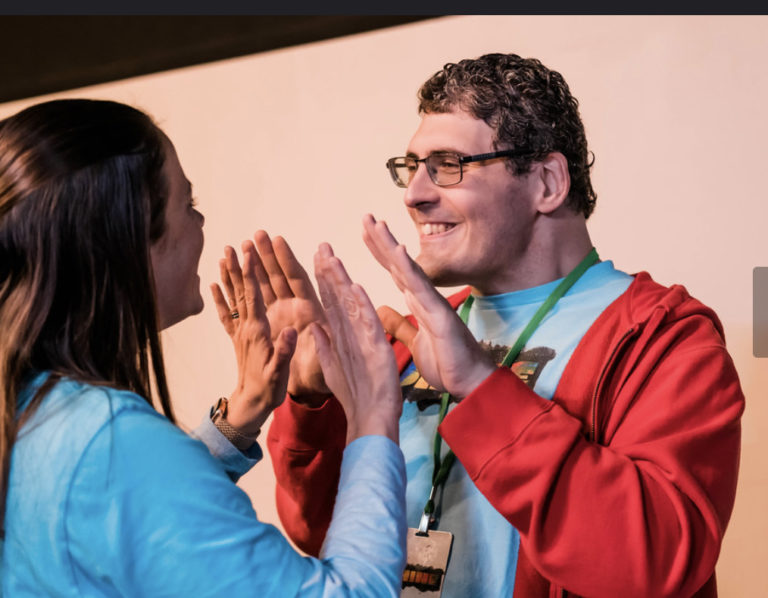 Image Description: A young man with Down syndrome smiles at the camera during a social event, wearing glasses, a blue shirt, and a light jacket, with other people in the background.