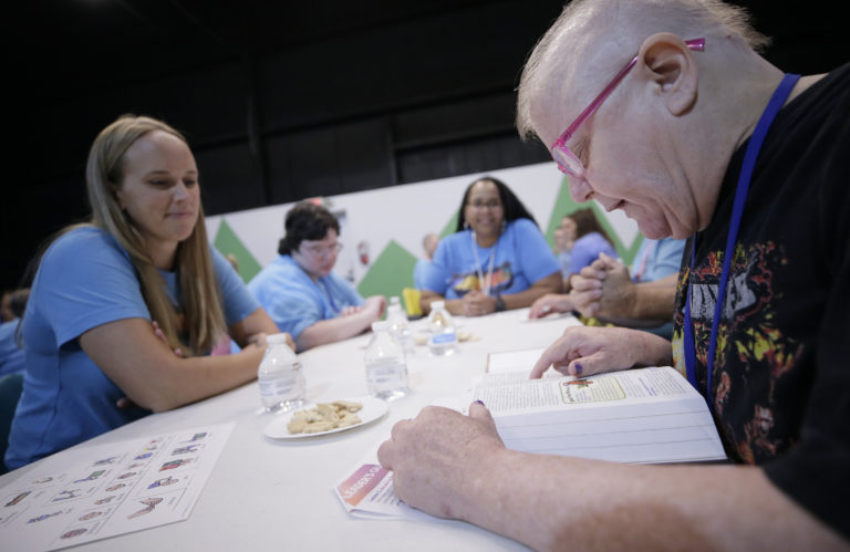 Image Description: A group of people sit at a table; one person reads a book while others watch, with snacks, water bottles, and a sheet featuring images on the table.