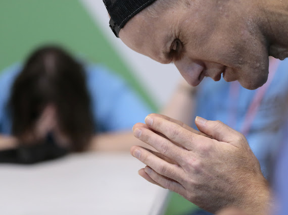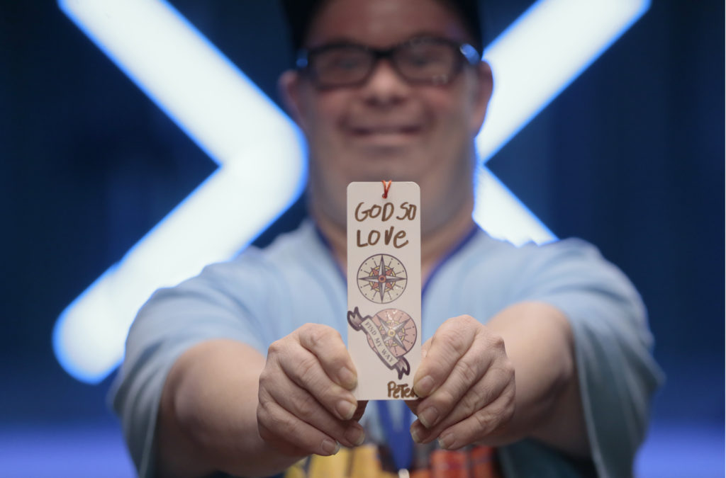 Image Description: A person holds a bookmark with a compass, heart, and text reading "God so love" and "peace," standing in front of a large, illuminated X shape.
