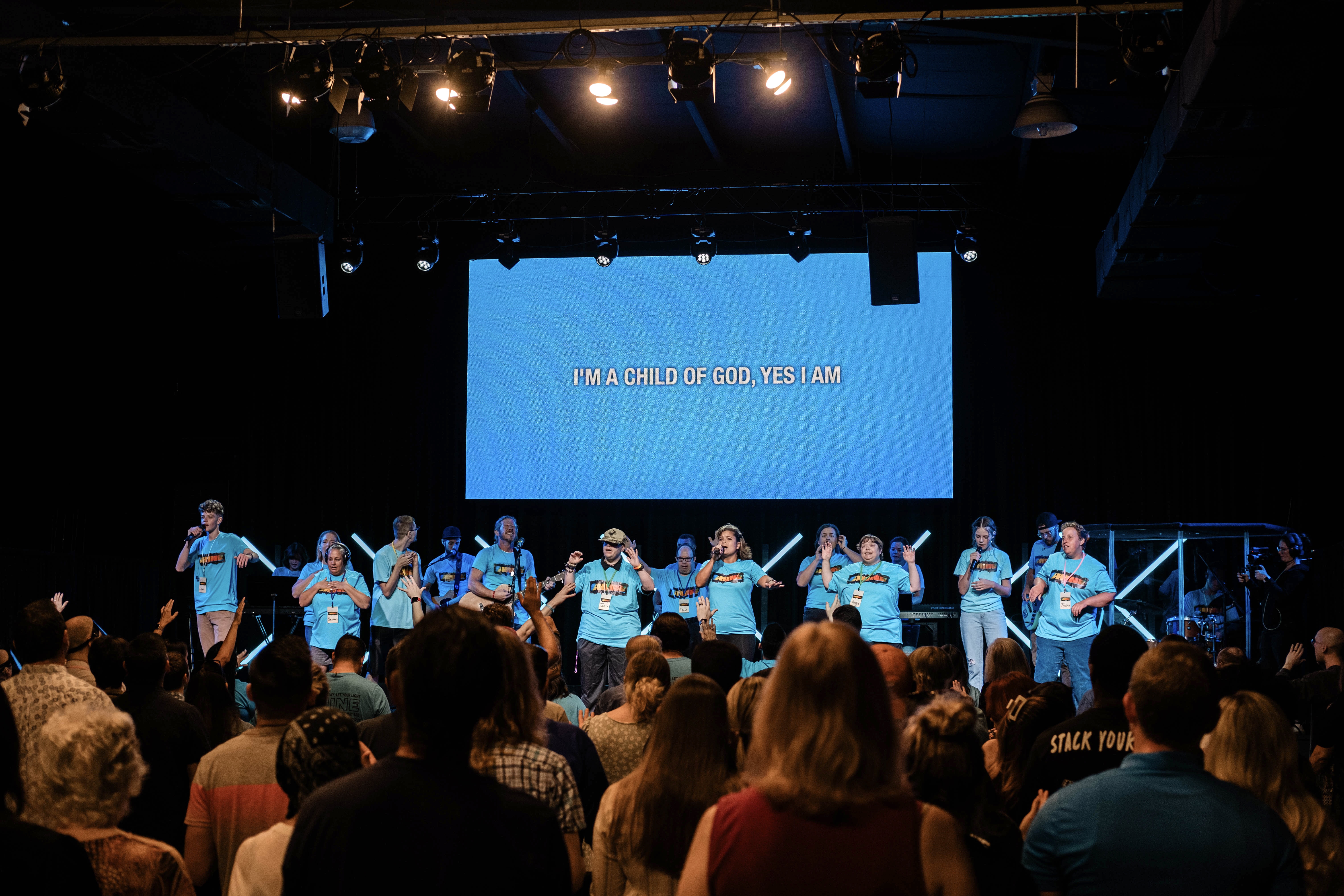 Image Description: A group of people in matching shirts stands on stage, singing in front of a screen displaying the lyrics "I'M A CHILD OF GOD, YES I AM" to an audience in a dimly lit room.