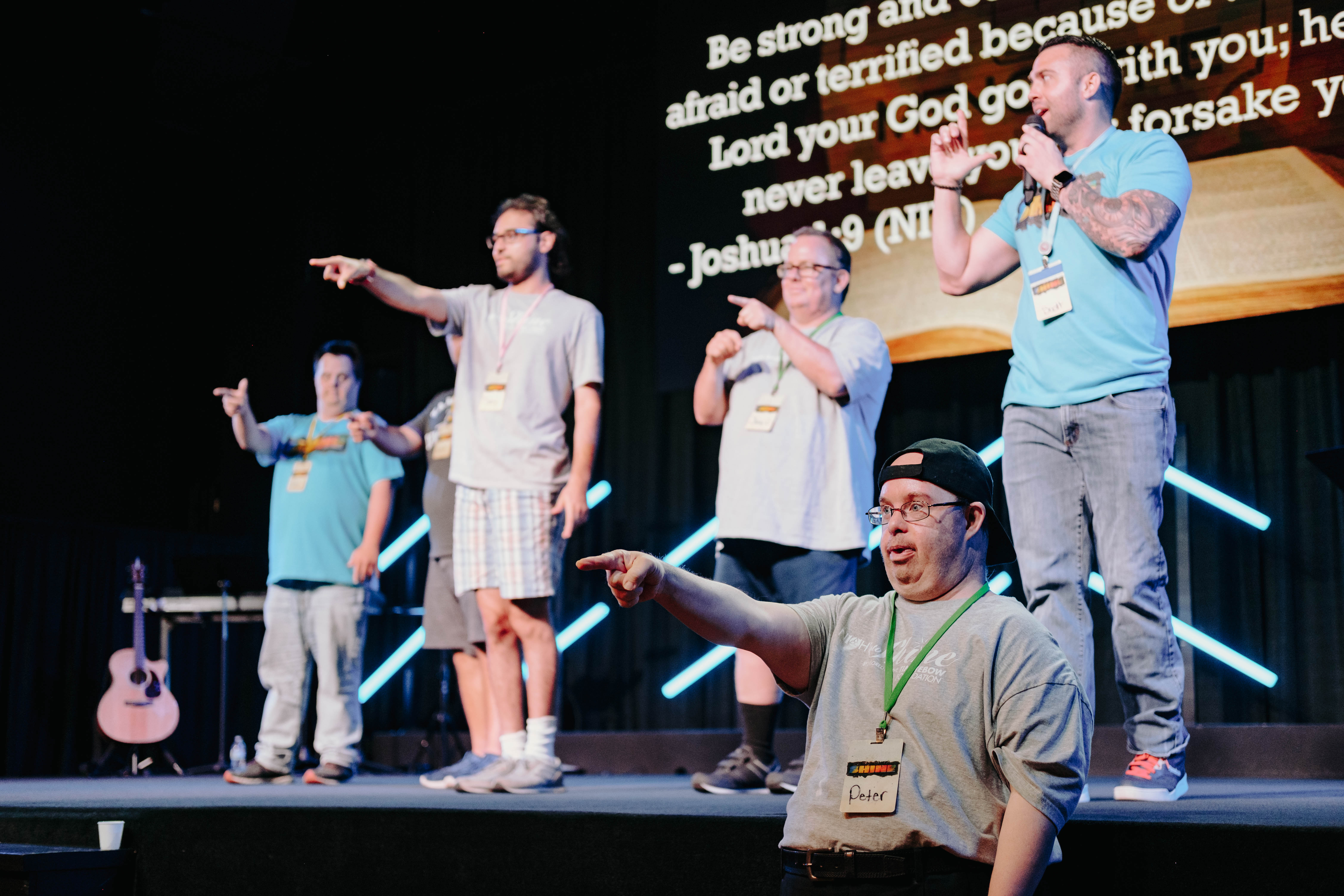 Image Description: Five people stand on a stage pointing forward, with a Bible verse projected on the screen behind them; one person is standing at the front edge of the stage.