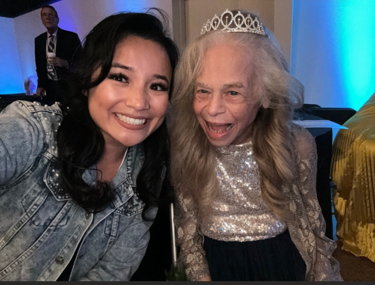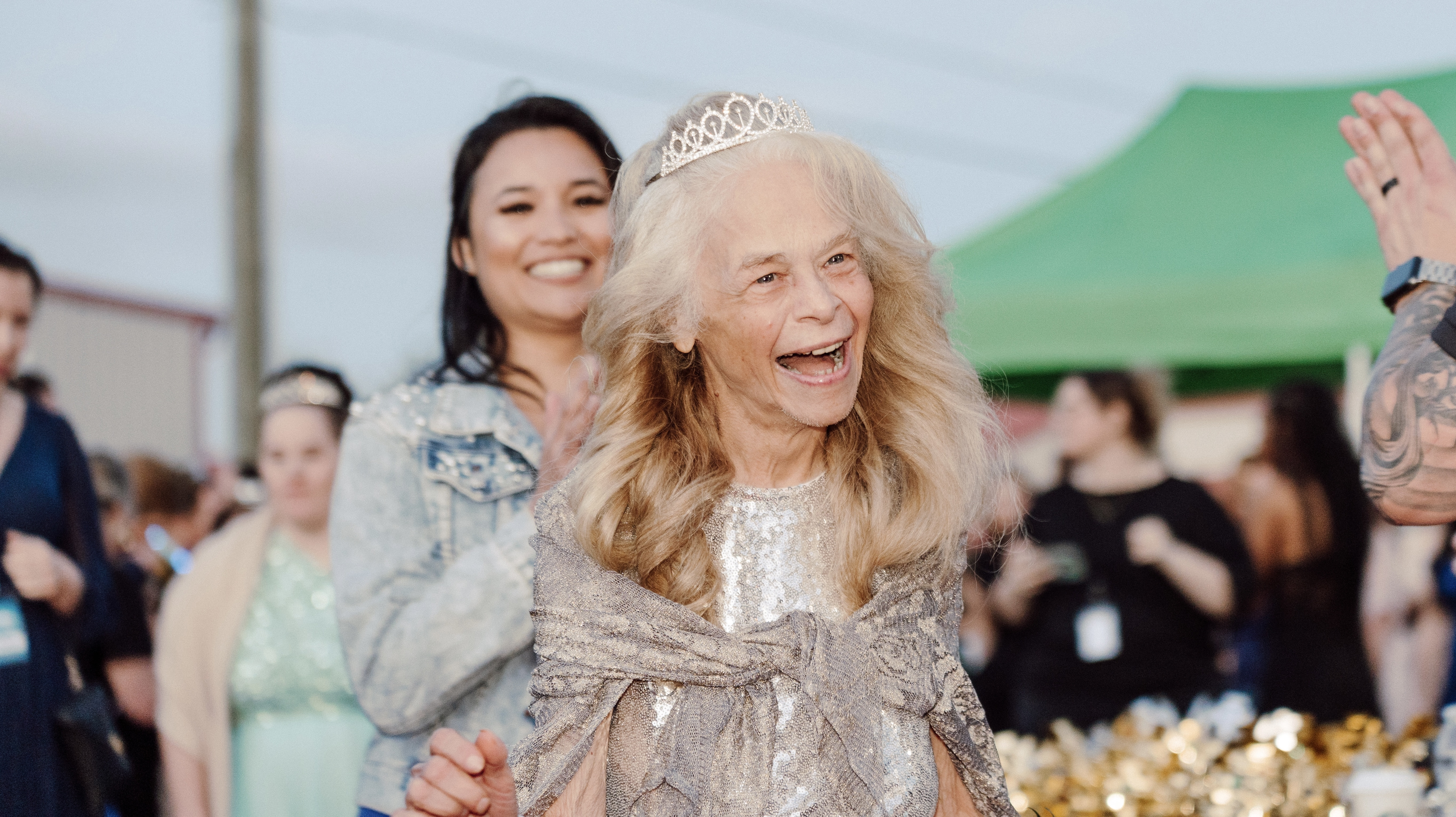 Image Description: Two women smiling at the camera; the woman on the right is wearing a sparkly dress and tiara, while the woman on the left is wearing a denim jacket.