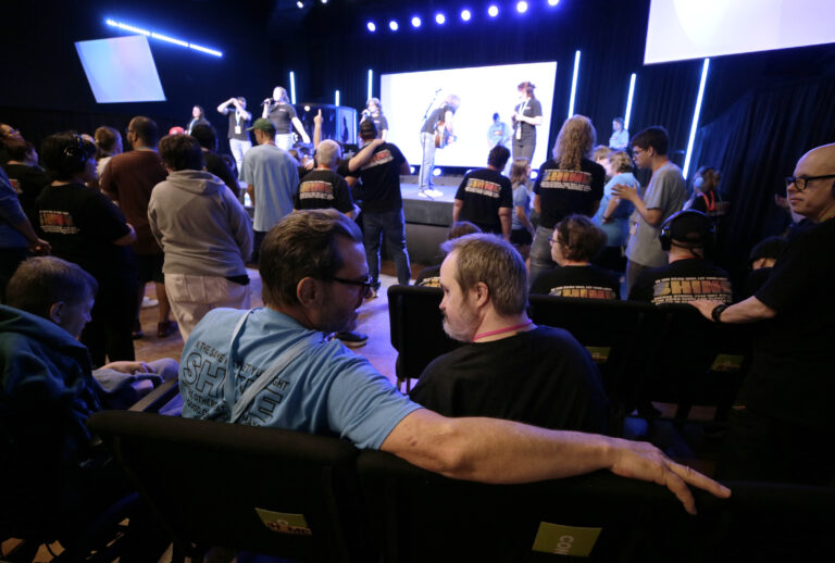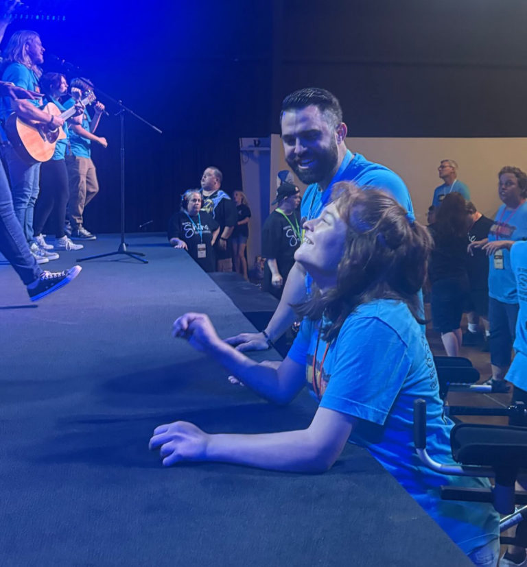 Image Description: A group of people wearing blue shirts enjoy a live music performance on stage; a man and a young person in a wheelchair smile near the stage.