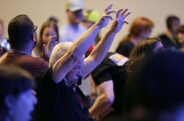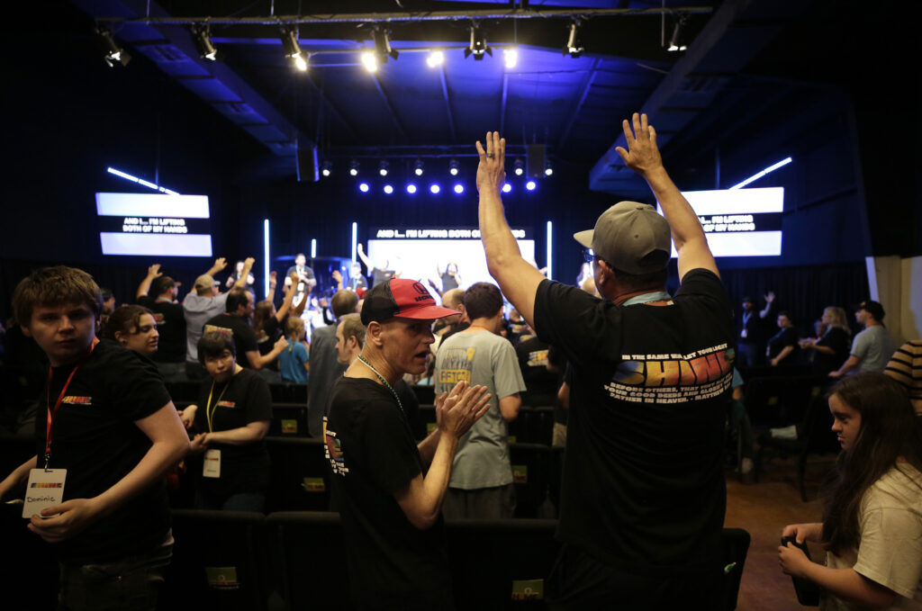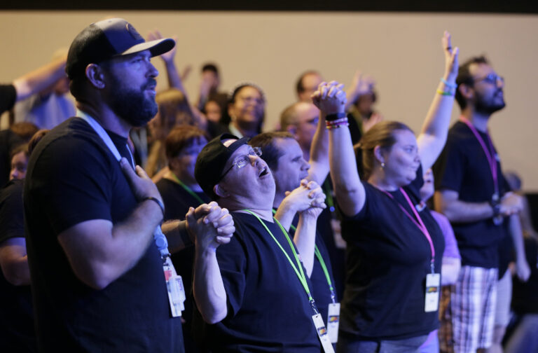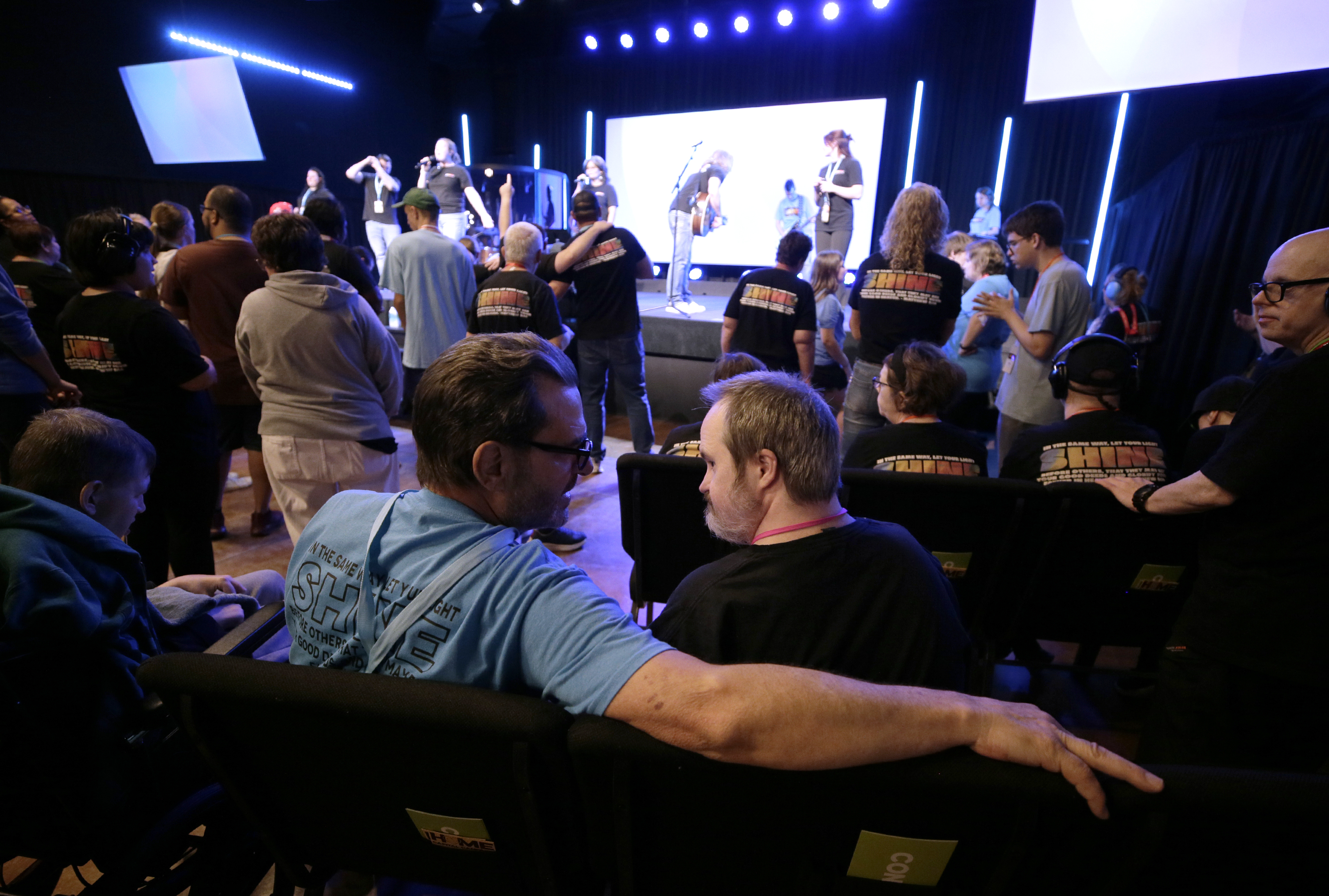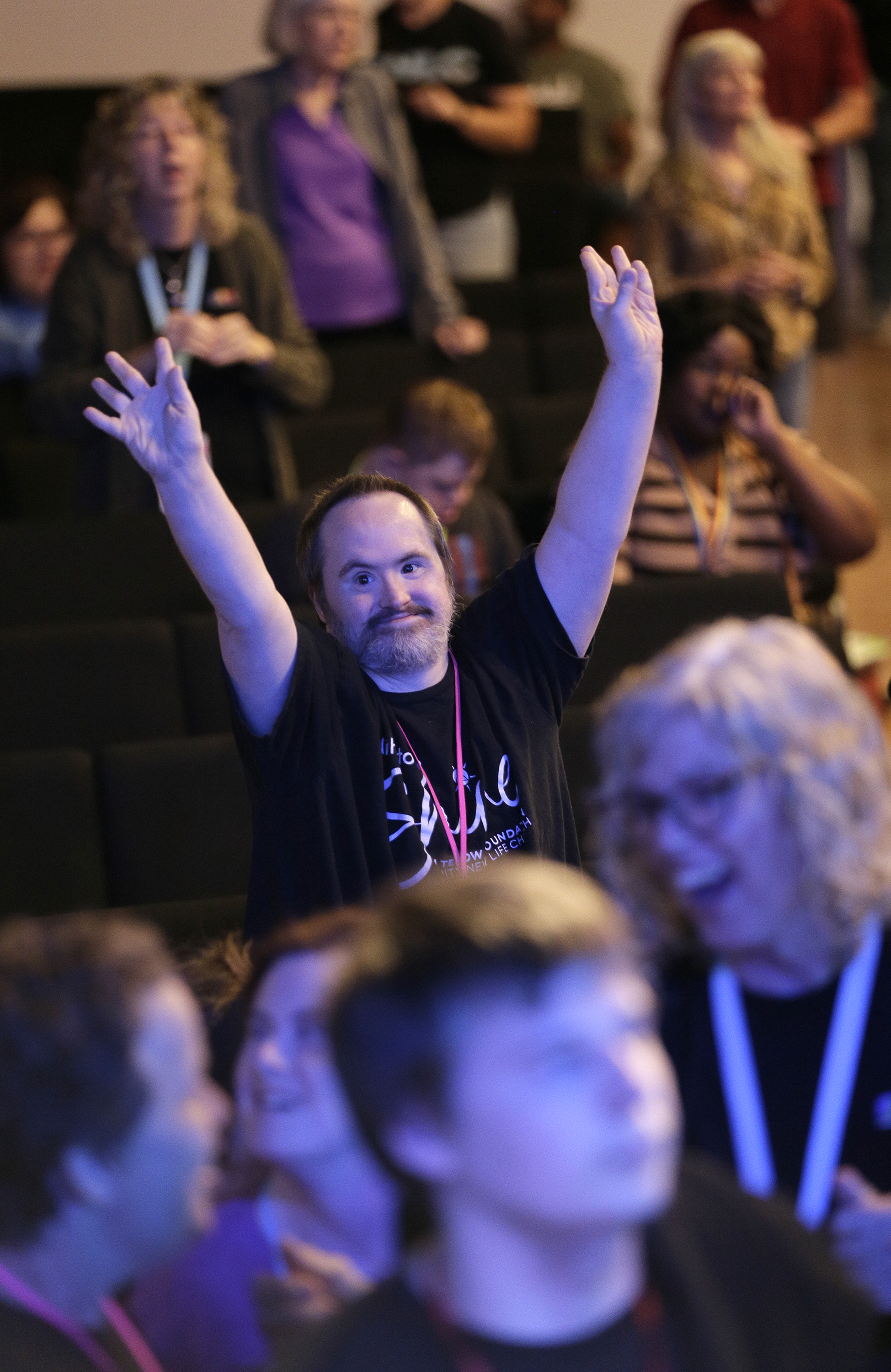 Image Description: A group of people gather in a dimly lit room with stage lights; some have their hands raised, and most wear matching t-shirts with lanyards.