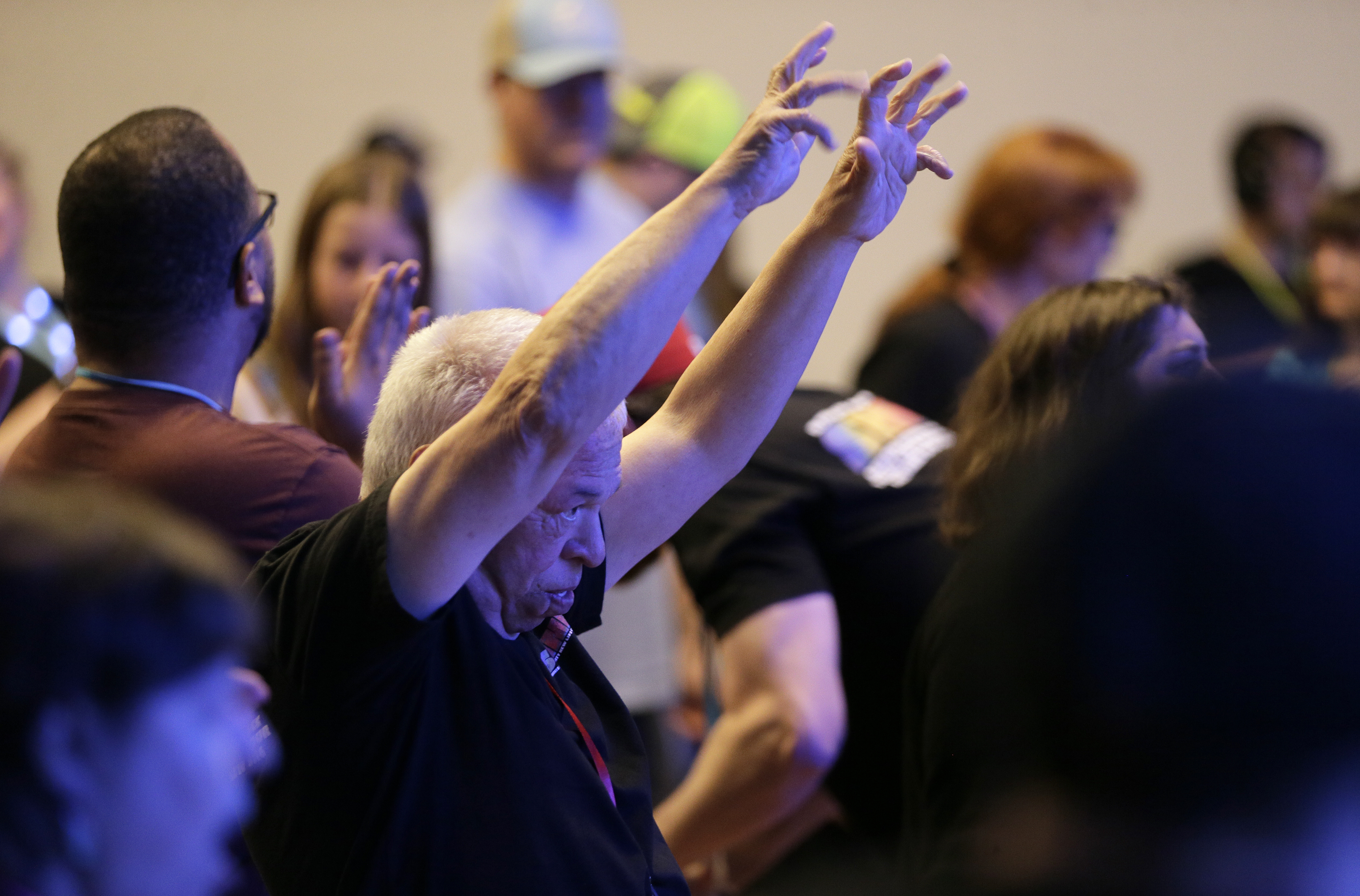 Image Description: An older man with white hair raises his arms amidst a group of people indoors, some appearing to be engaged or observing, with a blurred background.