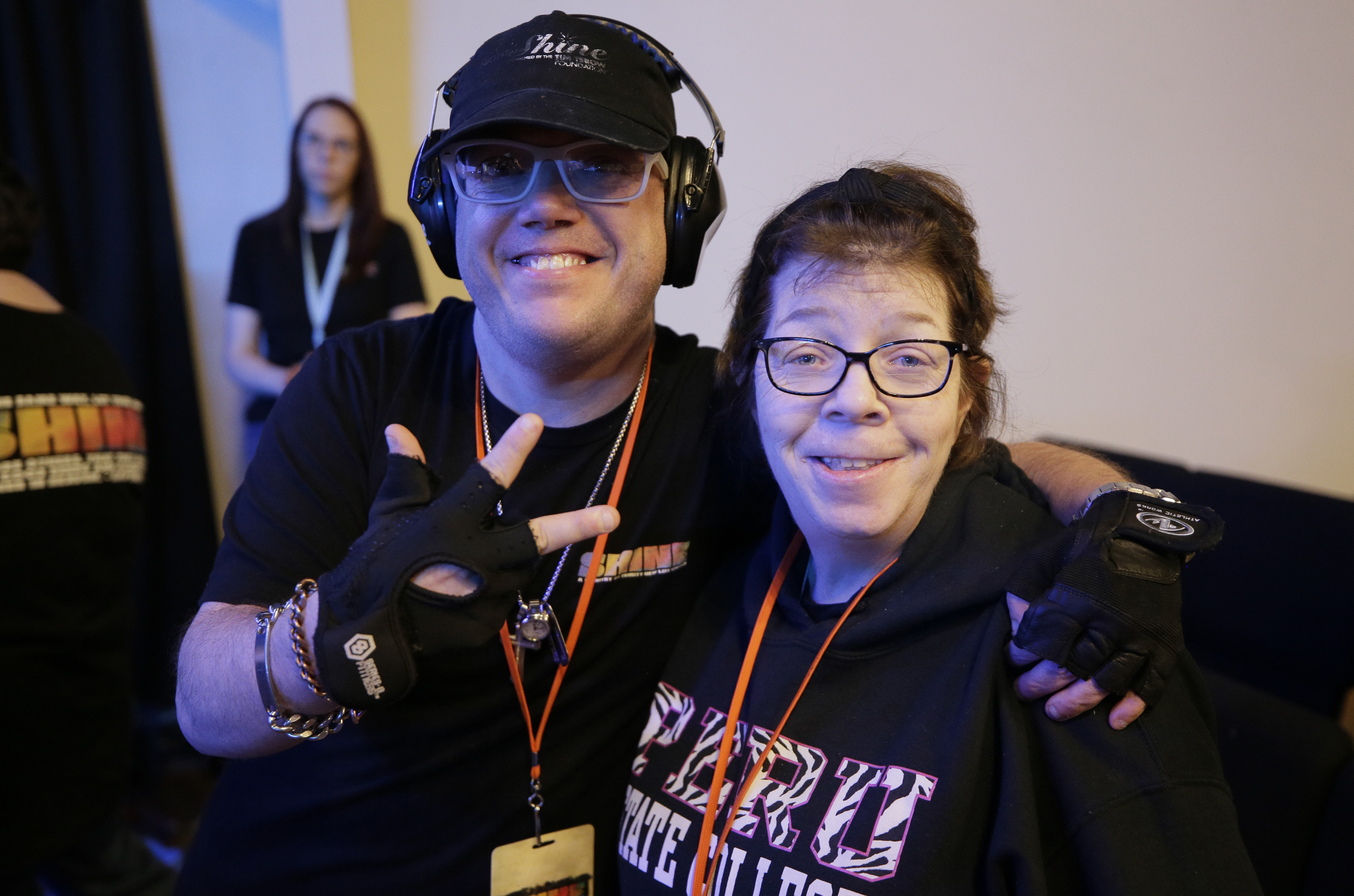 Image Description: Two people wearing glasses and black clothing smile at the camera; one person shows a peace sign and wears headphones, while the other has an event lanyard around their neck.