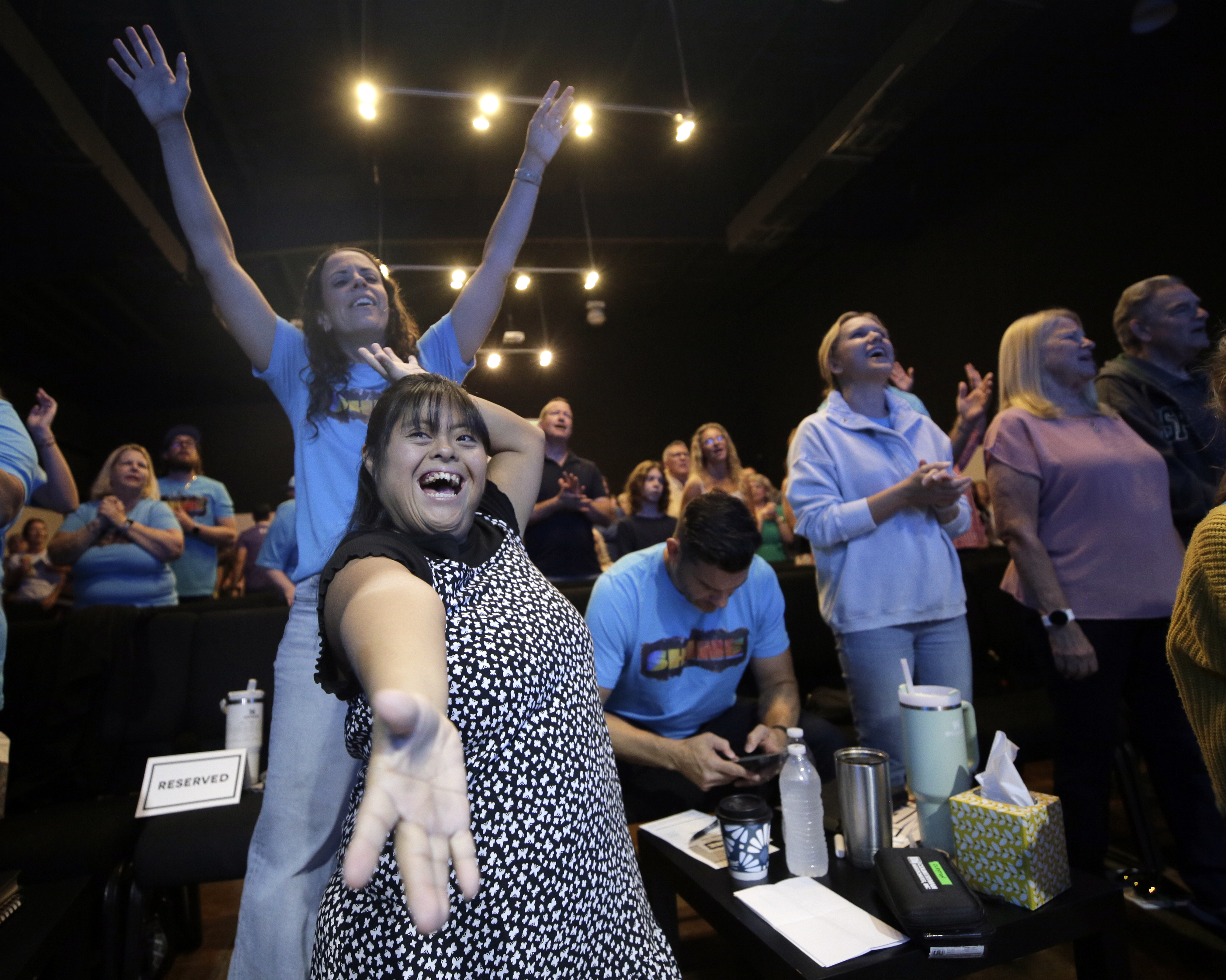 Image Description: A group of people stand together indoors; some have their hands raised and appear to be singing or celebrating, while others are seated or looking at their phones.