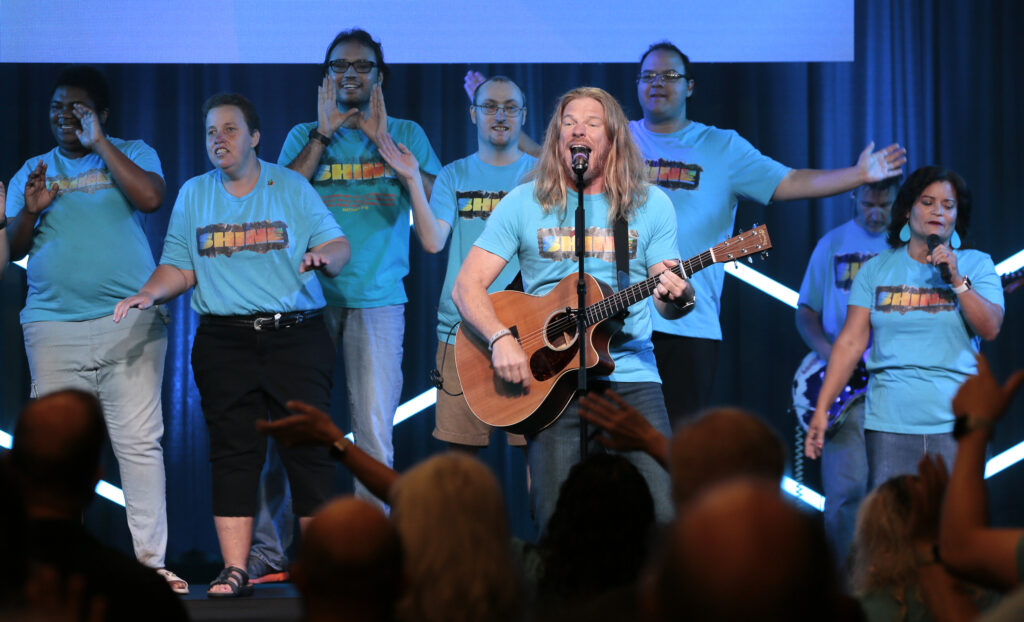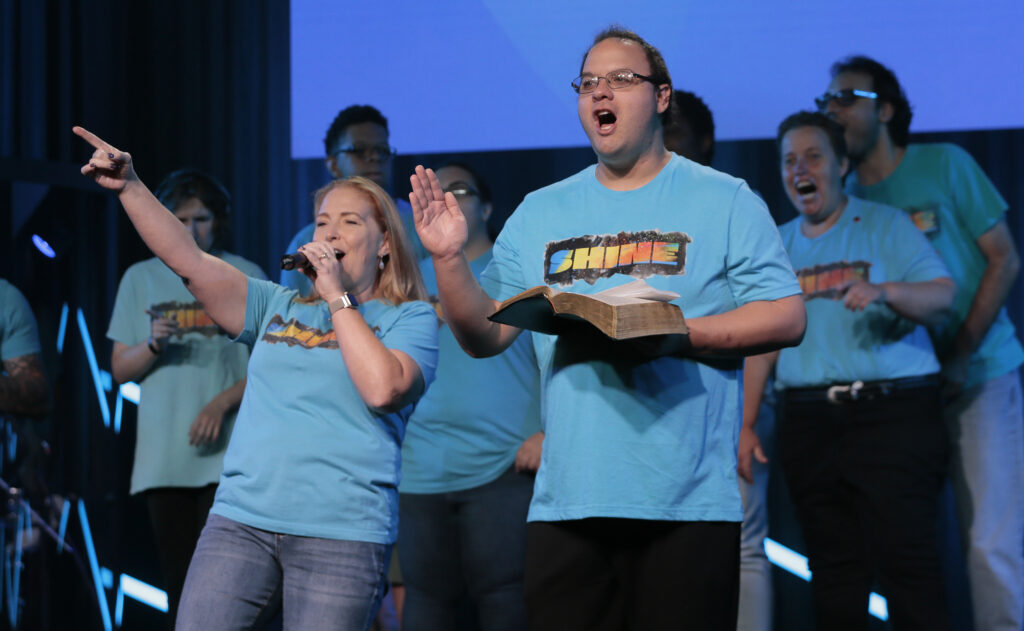 Image Description: A group of people wearing matching blue "SHINE" shirts sing enthusiastically on stage; one woman holds a microphone, and a man holds an open book.