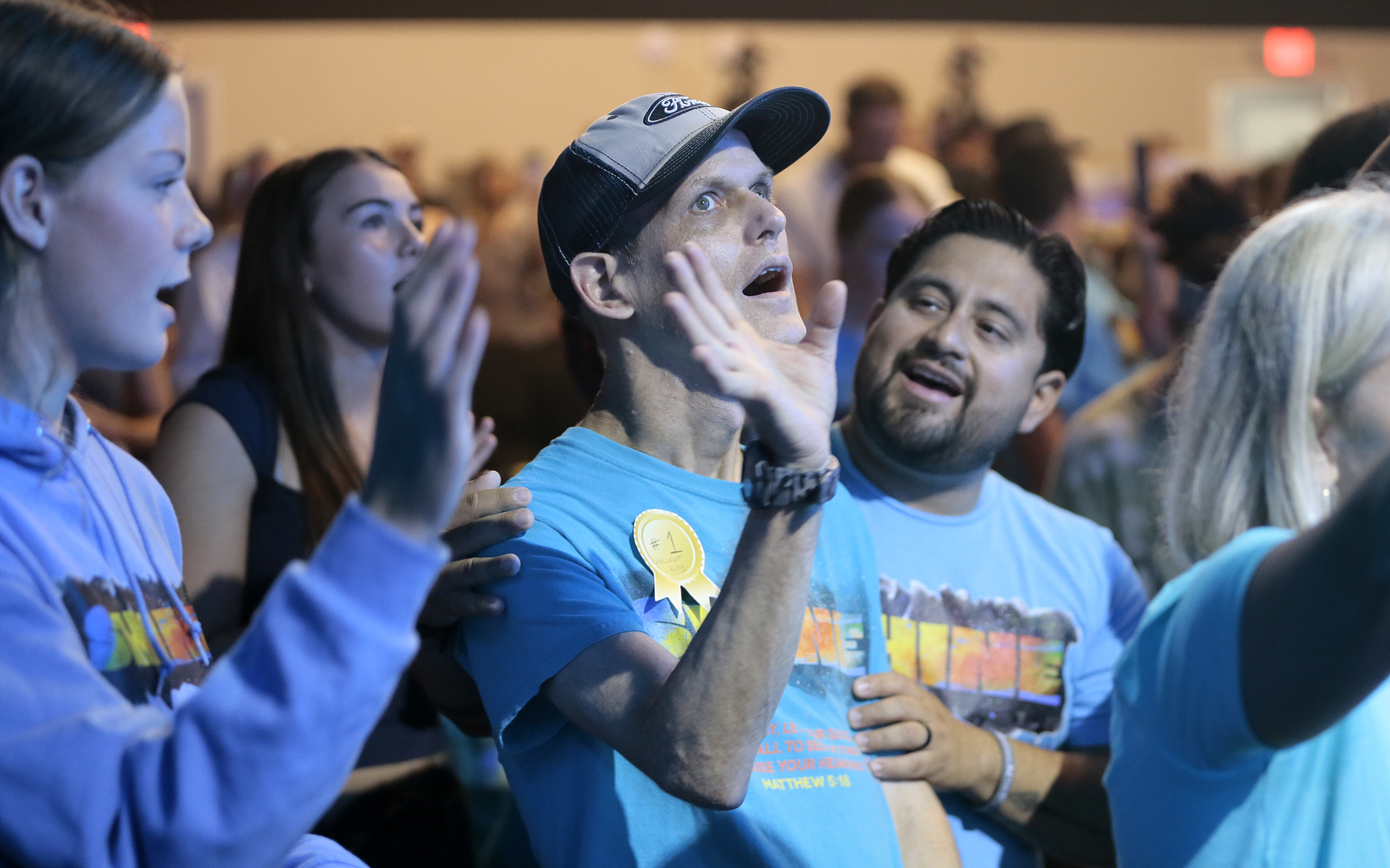Image Description: A man stands on stage clapping and smiling to an audience, with a projection behind him displaying Romans 12:21: “Don't let evil defeat you, but defeat evil by doing good.”.
