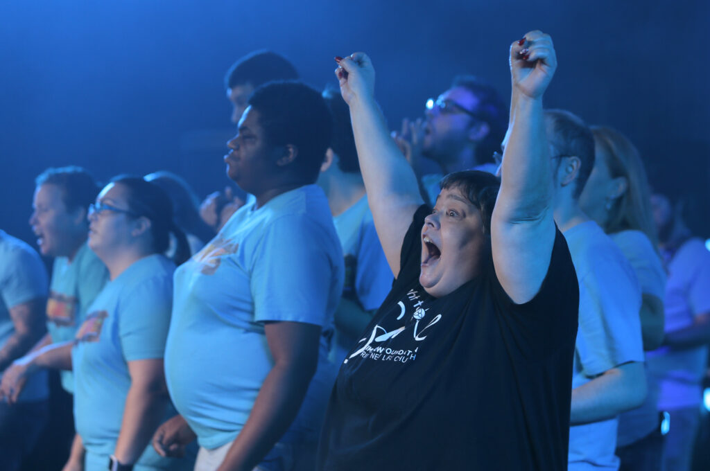 Image Description: A group of people sing and gesture on stage under blue lighting, while a person in a wheelchair raises their arms in the audience. A large screen displays song lyrics.