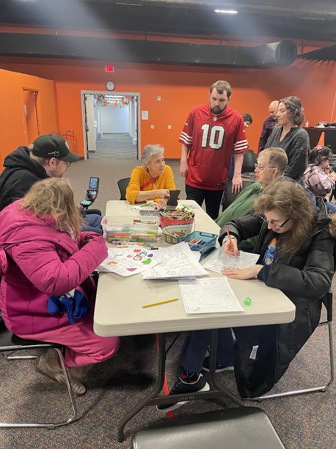 Image Description: A group of people sit and stand around a table, coloring and working on crafts in a brightly lit room with orange walls.
