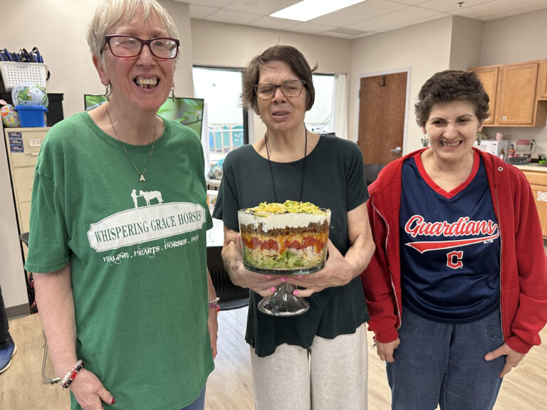 Three female retirement individuals. The woman in the middle is holding a large glass bowl with a taco salad.